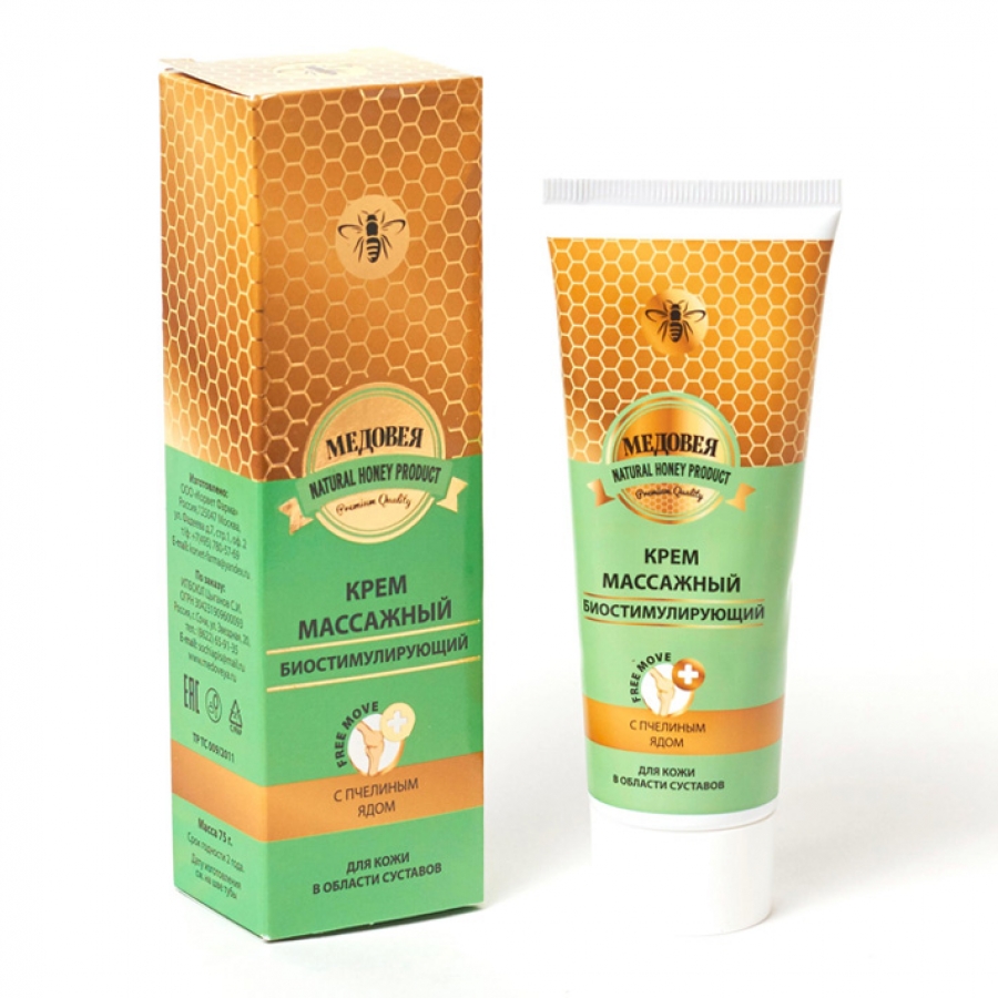 Крем для кожи массажный «Медовея» с пчелиным ядом способствует улучшению крово- и лимфообращения, стимуляции обмена веществ; снимает мышечное напряжение, усталость, отечность, увеличивает объем активных движений; повышает энергетический потенциал биоактивных точек тела, снижает ощущение дискомфорта; осуществляет питательную поддержку соединительным тканям.